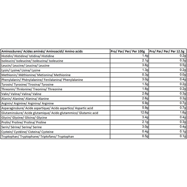 Toutes les protéines AMINO ANIMO sont obtenues à partir de semences biologiques de plantes soigneusement sélectionnées pour leur haute teneur en protéines et en vitamines, sans substances synthétiques, additifs chimiques, ingrédients génétiquement modifiés, conservateurs, colorants et arômes. Les protéines végétales AMINO ANIMO font partie des 1 % de fabricants de compléments alimentaires en Europe qui possèdent les trois certifications officielles (végétalien, sans gluten, biologique). En outre, ils sont membres officiels du programme "Beauty Without Bunnies" de PETA, qui certifie que la marque et ses fournisseurs sont tous deux "non testés sur les animaux", ce qui signifie qu'ils ne réalisent, ne fournissent, ne payent ni n'autorisent aucun test sur les animaux pour leurs ingrédients, formules ou produits finis, et qu'ils ne le feront pas à l'avenir.